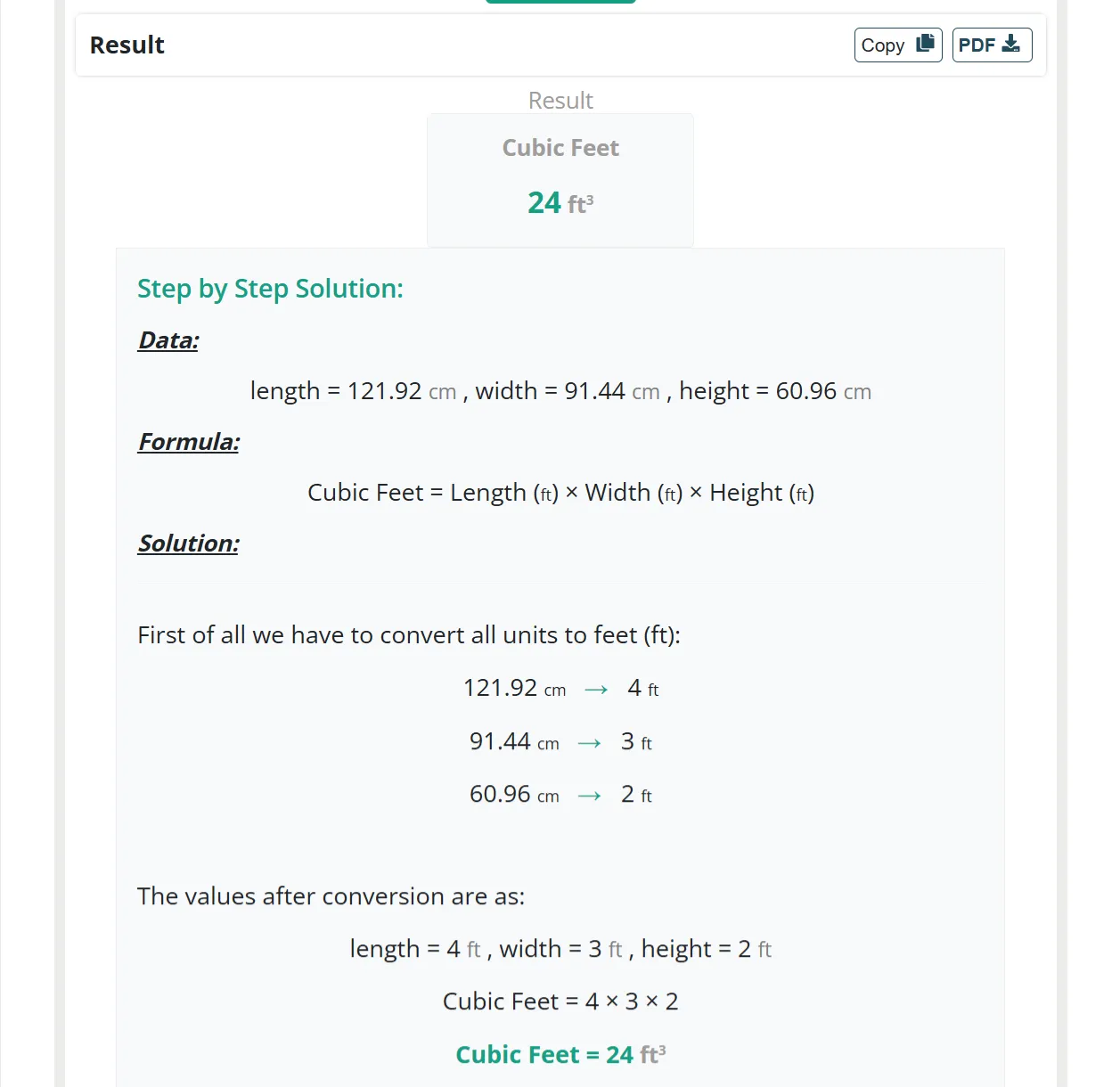 Let’s have a demonstration of the process by checking the result with online Cubic Feet Calculator,