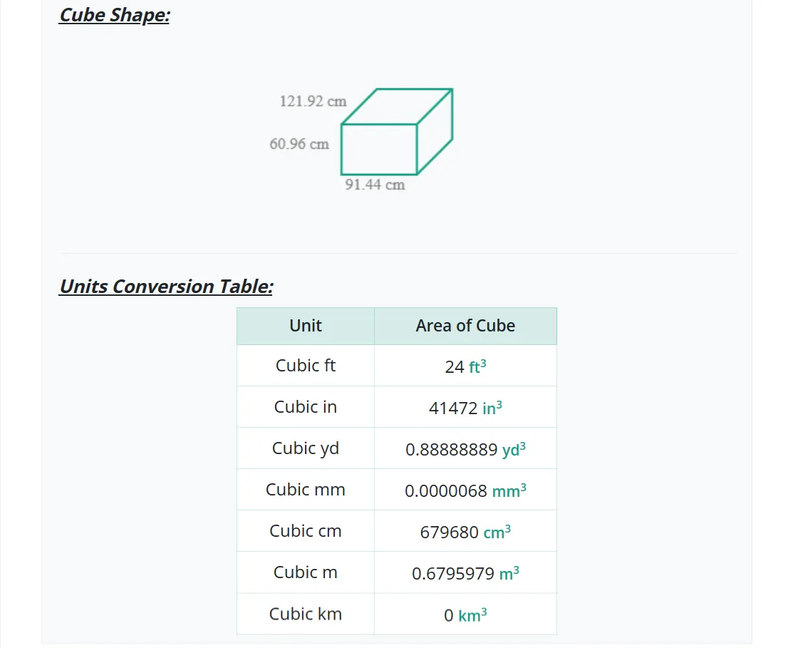 The tool also provided us with a unit conversion table and how the cube with a volume of 24 ft3 looks.