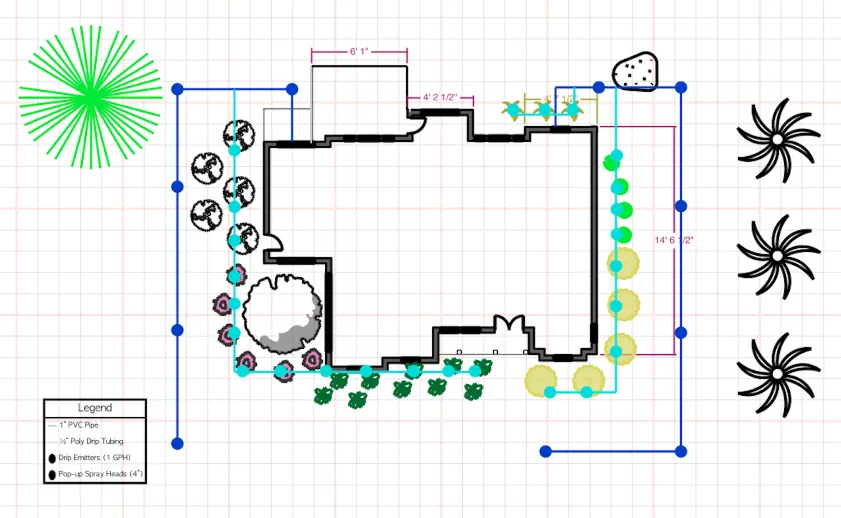 Start on your tablet. Use irrigation drawing software to sketch zones, heads, drip lines, valves, main lines. Add photos of tricky spots (existing trees, slopes, etc).