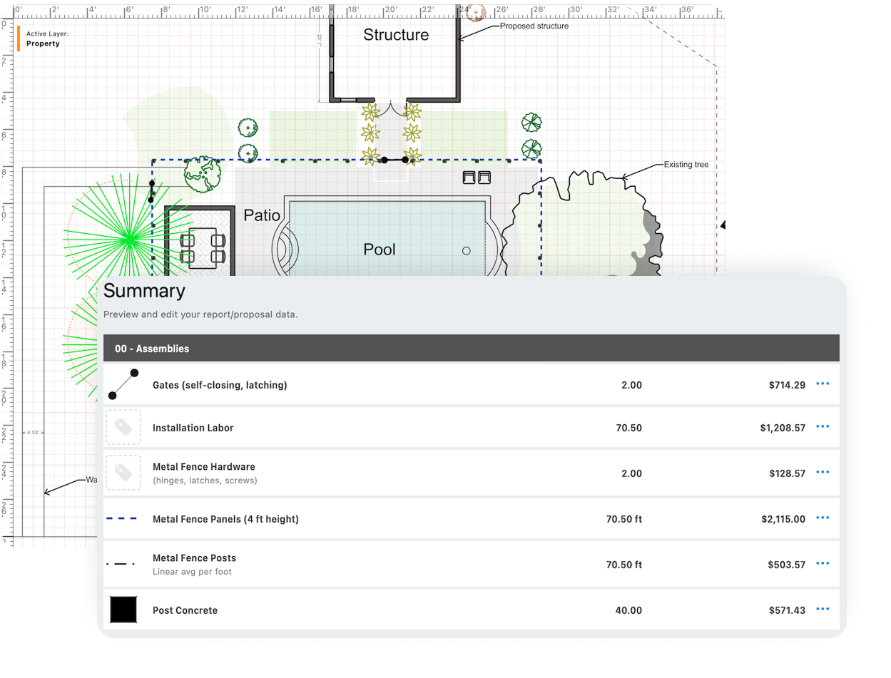 Fencing Contractors: Instantly calculate linear footage, post counts, concrete needs, and gate hardware. Draw once and quote before leaving the yard.