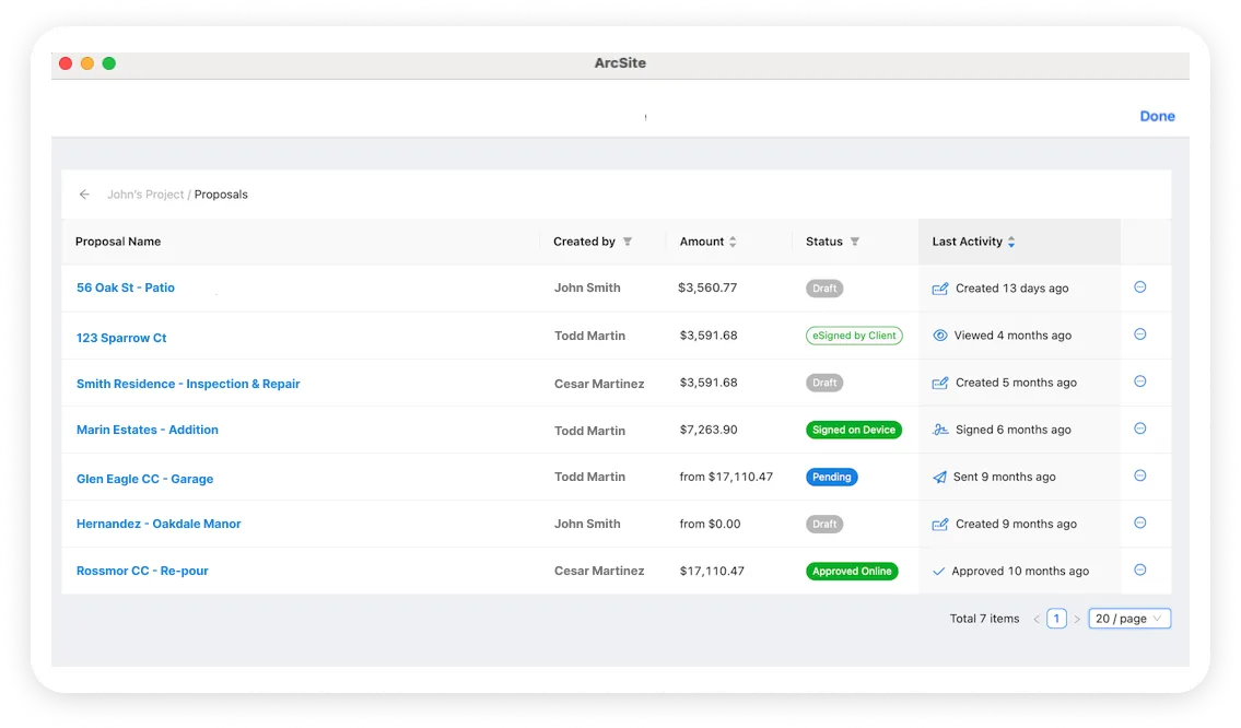 Easily access and manage all your concrete job proposals with an intuitive proposal dashboard. With a centralized platform, you can easily review, edit, and send proposals with ease. At a quick glance, get status and dates sent and signed to build the schedule of jobs or schedule follow ups.