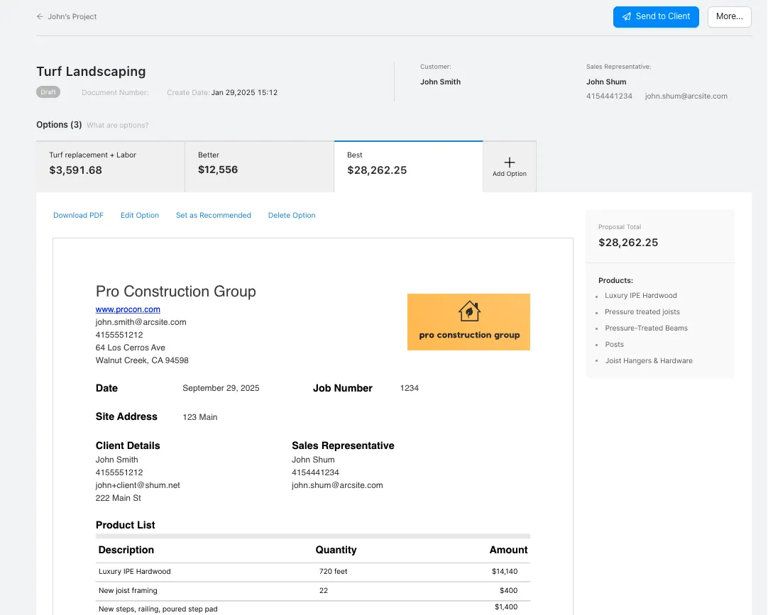 Impress clients every time. ArcSite’s deck estimating software creates polished proposals with your logo, colors, and company branding. Include line item breakdowns, photos, drawings, and payment terms—all in one PDF.