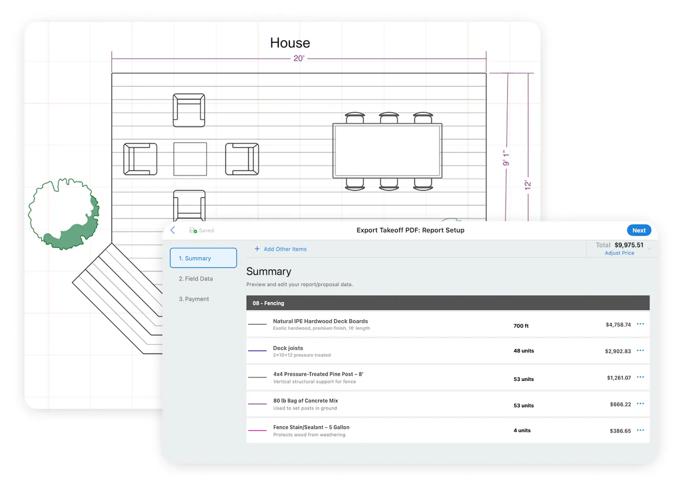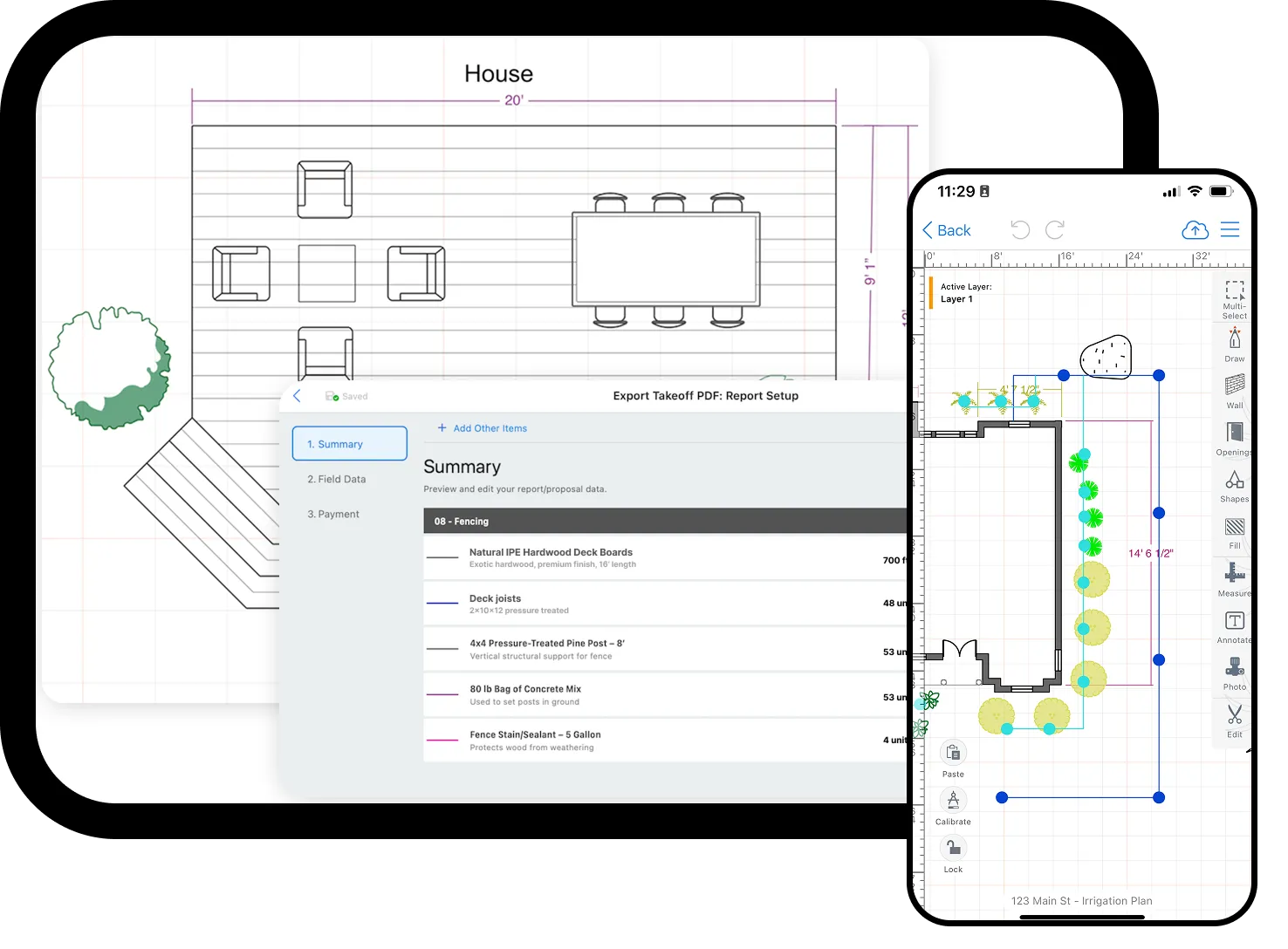 The best deck takeoff software goes beyond numbers by connecting takeoffs directly to proposals. ArcSite lets you generate client-ready estimates on the spot, turning detailed measurements into professional, branded documents. That means faster bids, fewer errors, and more closed projects—all from the same device you use to draw.