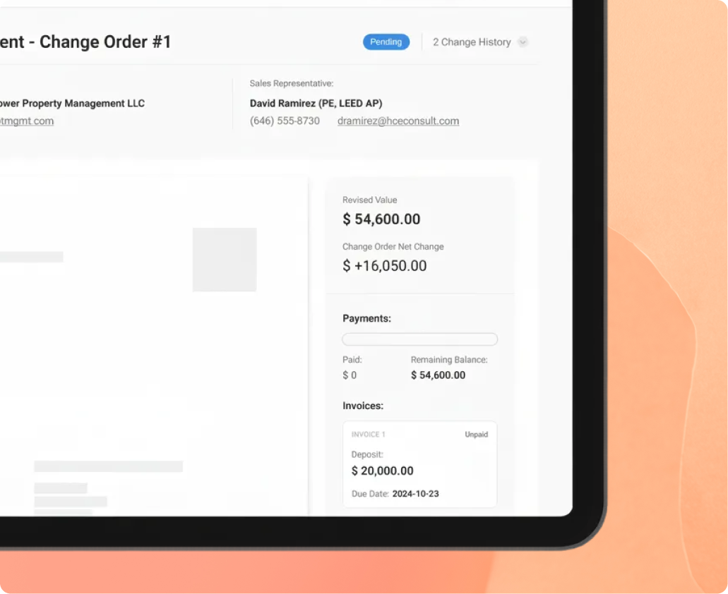 Clients can sign on the spot or from their phone. Once approved, you can immediately collect a deposit or balance—without chasing paper or bouncing between apps.