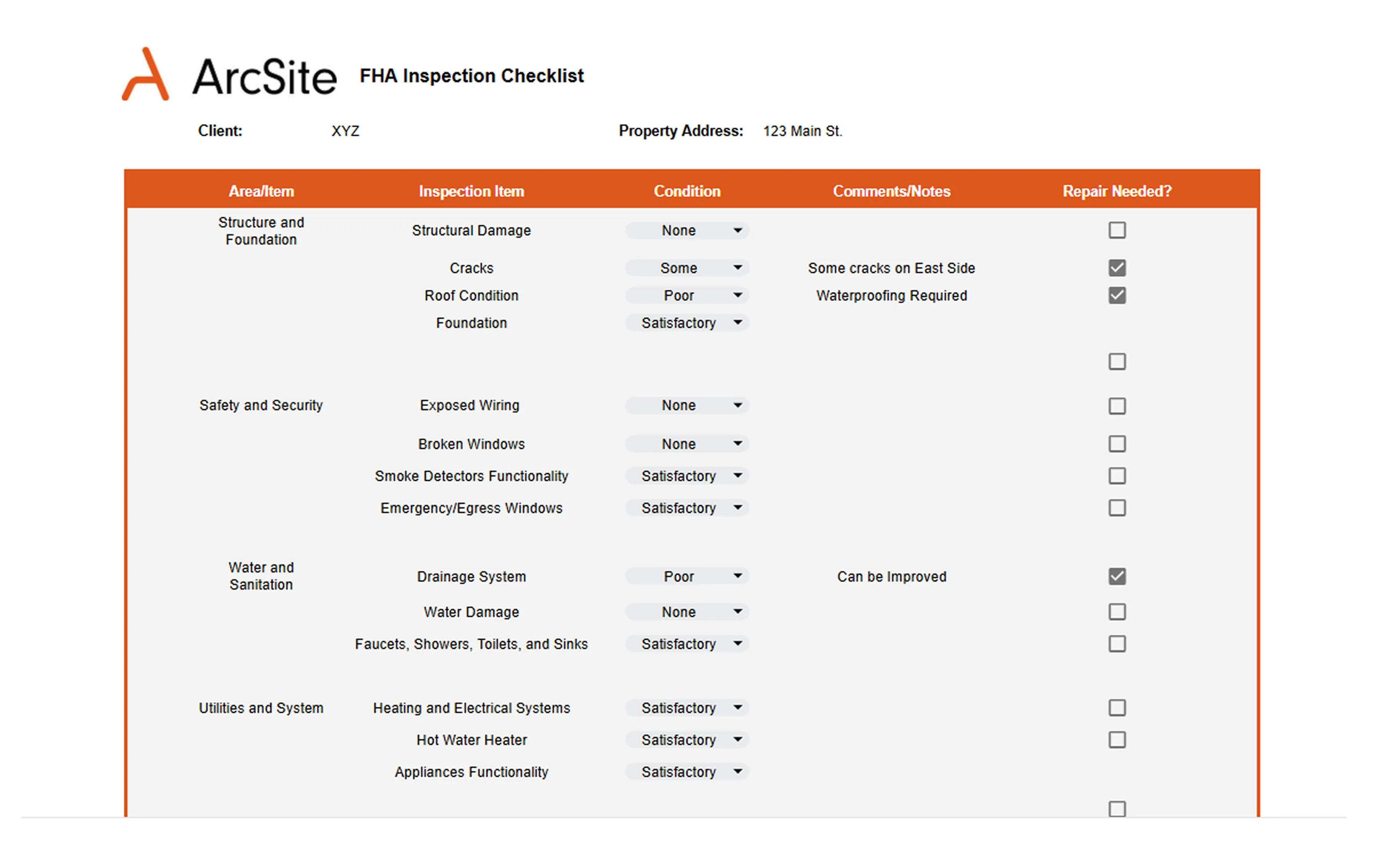 ArcSite's inspection checklist covers critical aspects such as safety and security, foundation, water and sanitation, environmental conditions, property access, and pest infestation. Use the checklist to deliver critical information and help your clients make informed decisions regarding their property purchase.